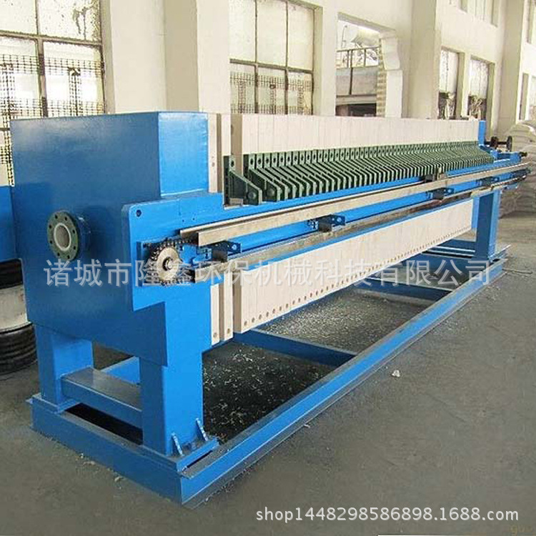 板框壓濾機有手動壓緊、機械壓緊和液壓壓緊三種形式。手動壓緊是螺旋千斤頂推動壓緊板壓緊;機械壓緊是電動機配H型減速箱,經(jīng)機架傳動部件推動壓緊板壓緊;液壓壓緊是有液壓站經(jīng)機架上的液壓缸部件推動壓緊板壓緊。兩橫梁把止推板和壓緊裝置連在一起構(gòu)成機架,機架上壓緊板與壓緊裝置餃接,在止推板和壓緊板之間依次交替排列著濾板和濾框,濾板和濾框之間夾著過濾介質(zhì);壓緊裝置推動壓緊板,將所有濾板和濾框壓緊在機架中,達(dá)到額定壓緊力后,即可進行過濾。懸浮液從止推板上的進料孔進入各濾室(濾框與相鄰濾板構(gòu)成濾室),固體顆粒被過濾介質(zhì)截留在濾室內(nèi),濾液則透過介質(zhì),由出液孔排出機外。