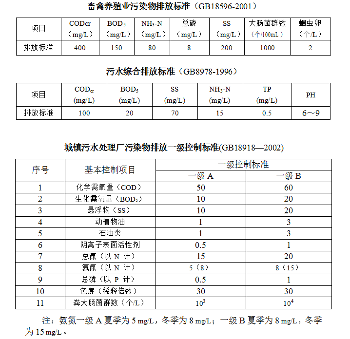 目前養(yǎng)殖廢水尚沒有統(tǒng)一的排放要求,排放標準多是根據(jù)地方部門的要求而確定。目前常見的處理要求有:《畜禽養(yǎng)殖業(yè)污染物排放標準》(GB18596-2001)、《污水綜合排放標準》(GB8978-1996)、《城鎮(zhèn)污水處理廠污染物排放標準》(GB18918—2002)。具體如下: