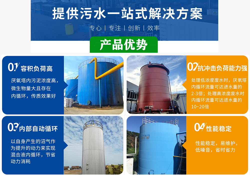 污水自下而上通過(guò)厭氧塔,反應(yīng)器底部有一個(gè)高濃度、高活性的污泥床,污水中的大部分有機(jī)污染物在此間經(jīng)過(guò)水解、發(fā)酵、產(chǎn)酸產(chǎn)氣步驟,復(fù)雜的有機(jī)污染物被厭氧微生物轉(zhuǎn)化為多種多樣的中間產(chǎn)物并轉(zhuǎn)化為沼氣(甲烷和二氧化碳等)。 厭氧反應(yīng)器負(fù)荷能力很大,適用于高、中濃度有機(jī)廢水的處理。運(yùn)行良好的厭氧反應(yīng)器有很高的有機(jī)污染物去除率。